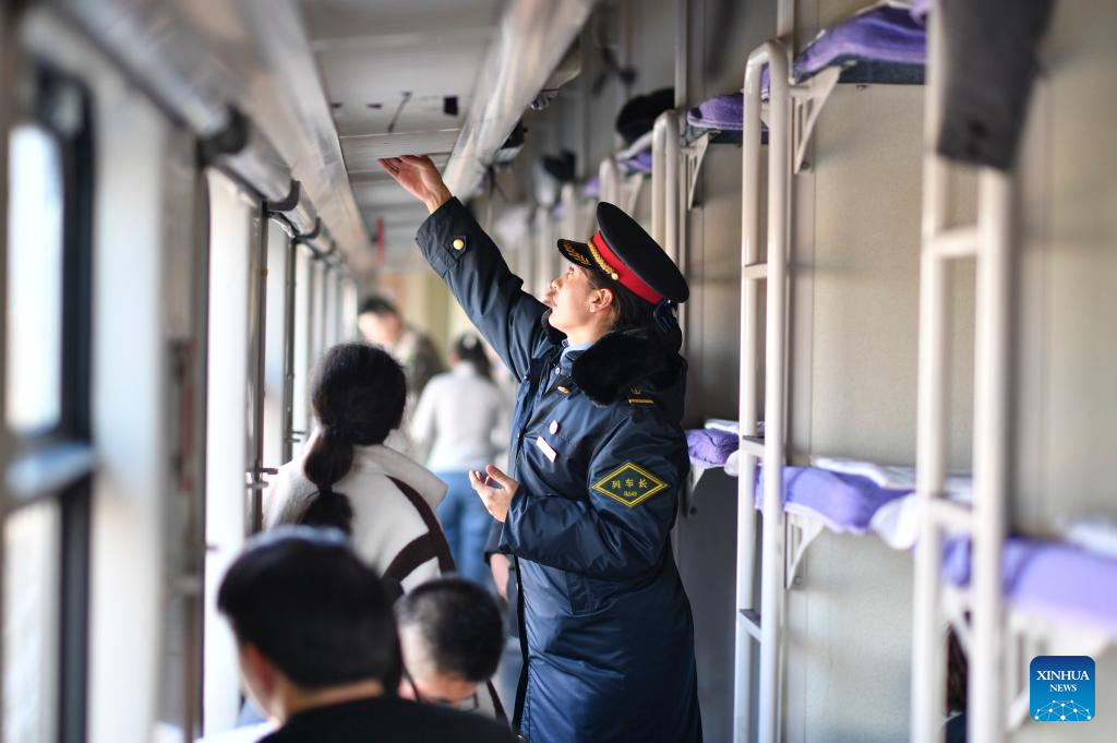 Train conductor Airkir Duliki ensures the safety of baggage on the overhead rack on the train linking Kashgar of northwest China's Xinjiang Uygur Autonomous Region and Chengdu of southwest China's Sichuan Province, Jan. 16, 2025. (Xinhua/Hu Huhu)