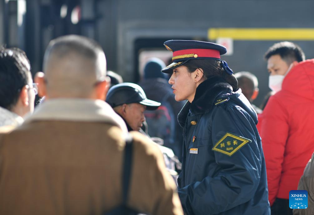 Train conductor Airkir Duliki guides passengers to board the train orderly at a train station along the railway route linking Kashgar of northwest China's Xinjiang Uygur Autonomous Region and Chengdu of southwest China's Sichuan Province, on Jan. 16, 2025. (Xinhua/Hu Huhu)
