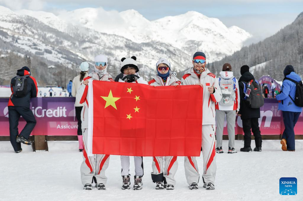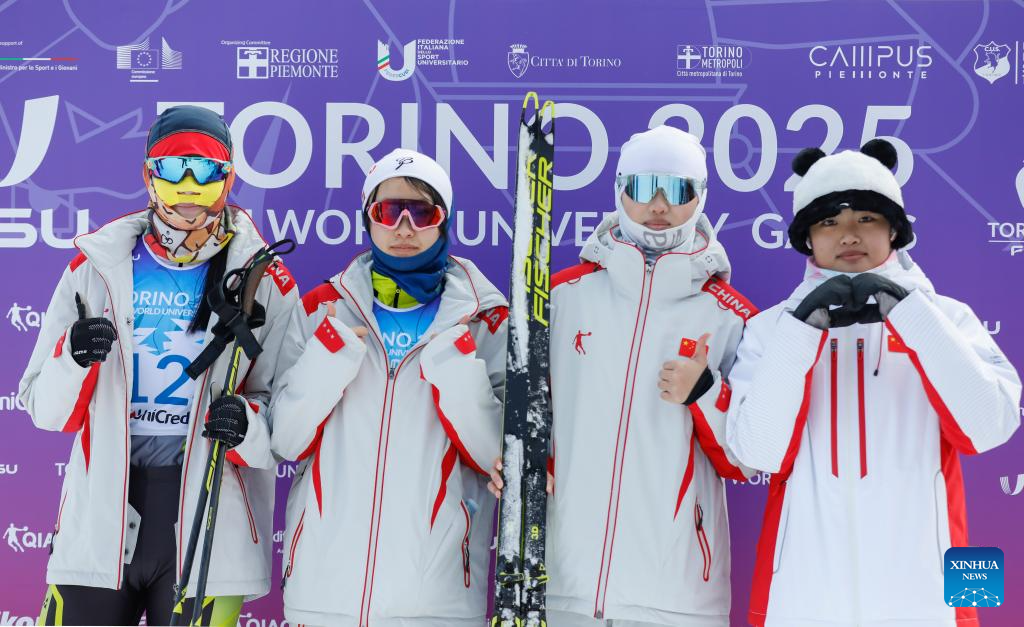 Liu Ruoxuan (2nd L) of China is welcomed by her teammates after finishing the cross-country skiing women's 4x7.5km relay at the 2025 FISU Winter World University Games in Pragelato, Italy, Jan. 21, 2025. (Xinhua/Zhang Fan)