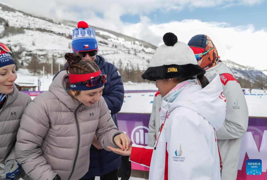 Zang Xiaokun (R) of China gives a pin to a member of the Czech Republic after the cross-country skiing women's 4x7.5km relay at the 2025 FISU Winter World University Games in Pragelato, Italy, Jan. 21, 2025. (Xinhua/Zhang Fan)