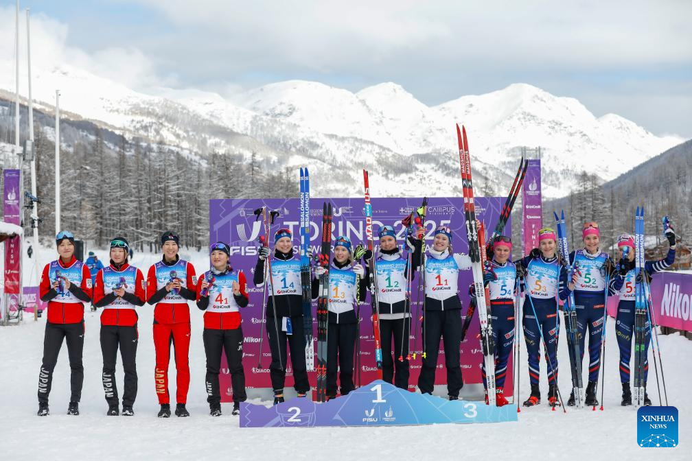 Gold-medalist team Finland (C), silver-medalist team Japan (L) and bronze-medalist team France pose for photos at the mascot ceremony after the cross-country skiing women's 4x7.5km relay at the 2025 FISU Winter World University Games in Pragelato, Italy, Jan. 21, 2025. (Xinhua/Zhang Fan)