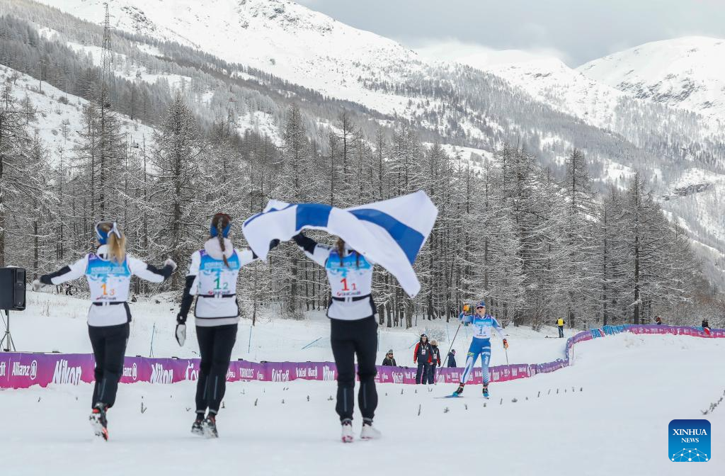 Anni Lindroos (1st R) of Finland sprint to the finishing line while her teammates cheering for her during the cross-country skiing women's 4x7.5km relay at the 2025 FISU Winter World University Games in Pragelato, Italy, Jan. 21, 2025. (Xinhua/Zhang Fan)