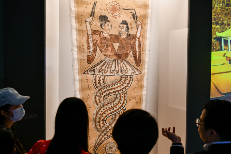 They also reflect social conventions, as seen in this Tang Dynasty (618–907 CE) painting of Fuxi and Nüwa discovered in Xinjiang's Astana Cemetery. Nüwa is shown in the photo clutching a compass, while Fuxi is shown with a ruler. "Compass and ruler" (規矩) translates to "standards" in Chinese.