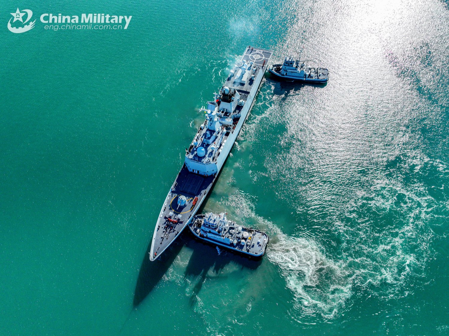 Two tugboats attached to a destroyer flotilla with the navy under the Chinese PLA Northern Theater Command assist the Type-054A guided missile frigate Wuhu (Hull 539) in unberthing operation during a maritime training exercise on January 2, 2025. (eng.chinamil.com.cn/Photo by Ma Yubin)