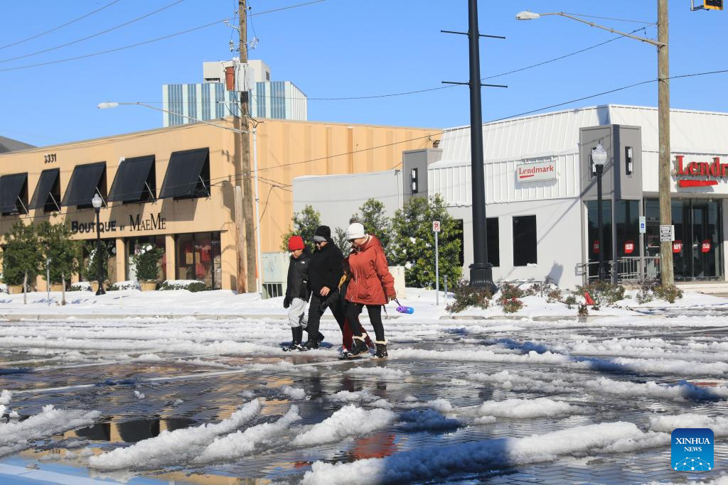 People walk on a street with slush in New Orleans, Louisiana, the United States, on Jan. 22, 2025. A rare winter storm, known as Enzo, has swept through the southern U.S. with record-breaking snow and bitterly cold weather to typically mild regions along the Gulf Coast, claiming at least nine lives as of Wednesday morning. New Orleans, the biggest city in coastal state Louisiana, on Tuesday experienced its heaviest snowfall since 1948, with 8 inches falling in a single day, far surpassing the previous record of 2.7 inches, according to a report from the weather.com on Wednesday. (Photo by Lan Wei/Xinhua)