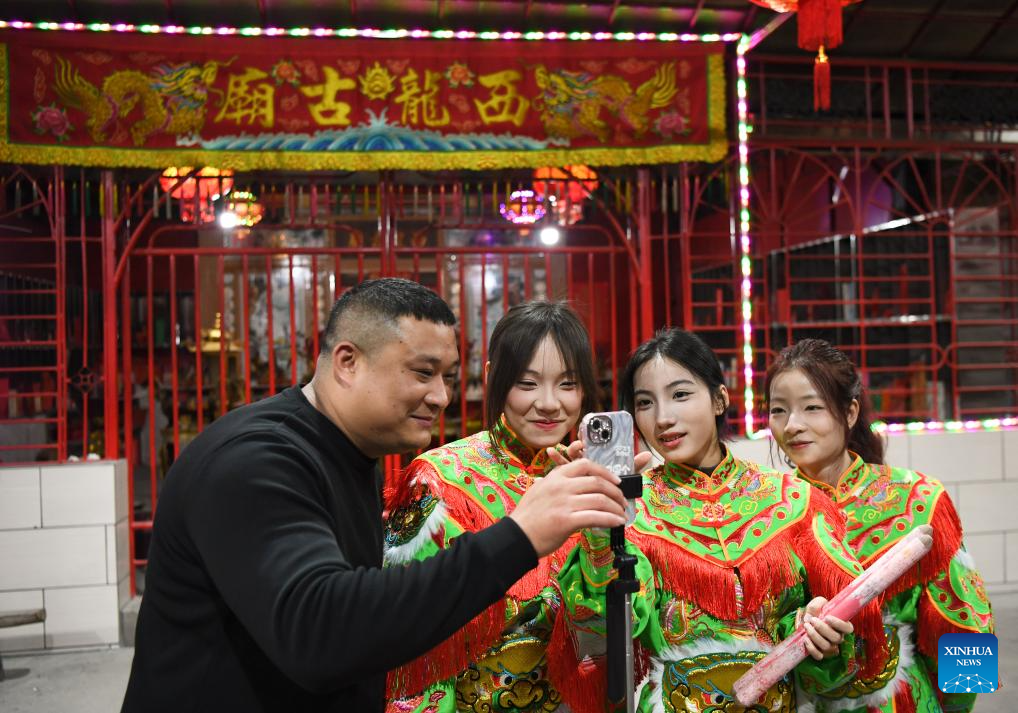 Yingge dance coach Chen Tanpeng (1st L) watches videos via live stream with his students in Chaoyang District of Shantou City, south China's Guangdong Province, Jan. 20, 2025. Local Yingge dance troupes have been busy in rehearsing for performances to greet the upcoming Chinese New Year. The Yingge dance, or "dance to the hero's song," merges opera, dance, and martial arts. Dating back to the Ming Dynasty (1368-1644), this traditional dance is often performed during traditional Chinese festivals. The Yingge dance was listed as the first batch of national intangible cultural heritage in 2006. (Xinhua/Deng Hua)
