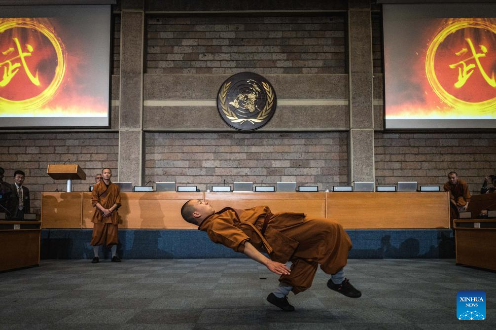 Kungfu performers from the Shaolin Temple perform during a Chinese cultural event at the United Nations Office at Nairobi (UNON) premises in Nairobi, Kenya, Jan. 22, 2025. (Xinhua/Wang Guansen)