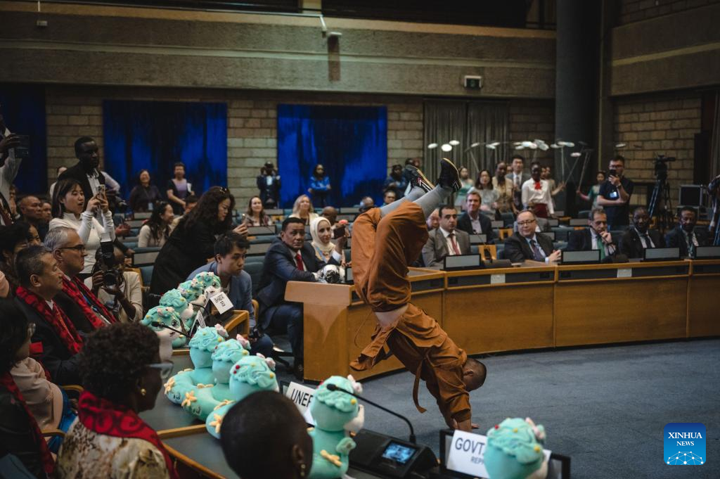 Acrobats perform during a Chinese cultural event at the United Nations Office at Nairobi (UNON) premises in Nairobi, Kenya, Jan. 22, 2025. (Xinhua/Wang Guansen)