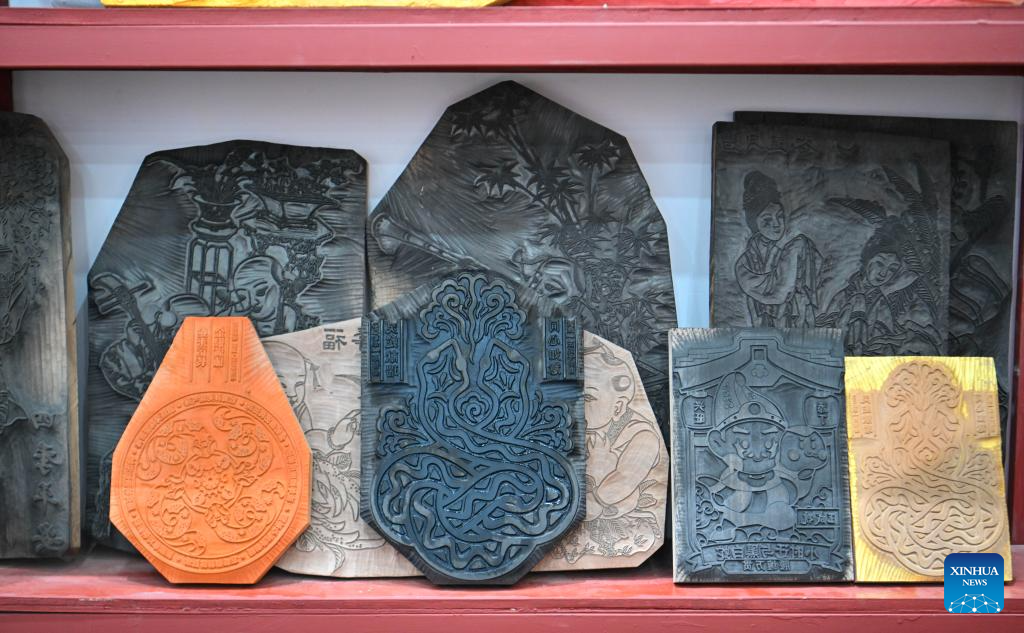 An inheritor of Yangliuqing woodblock new year picture craft prepares to print a new year picture at a studio in Yangliuqing Town, Tianjin, north China, Jan. 20, 2025.