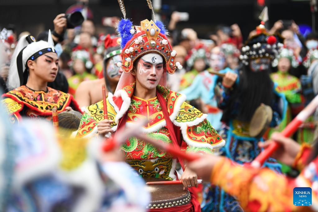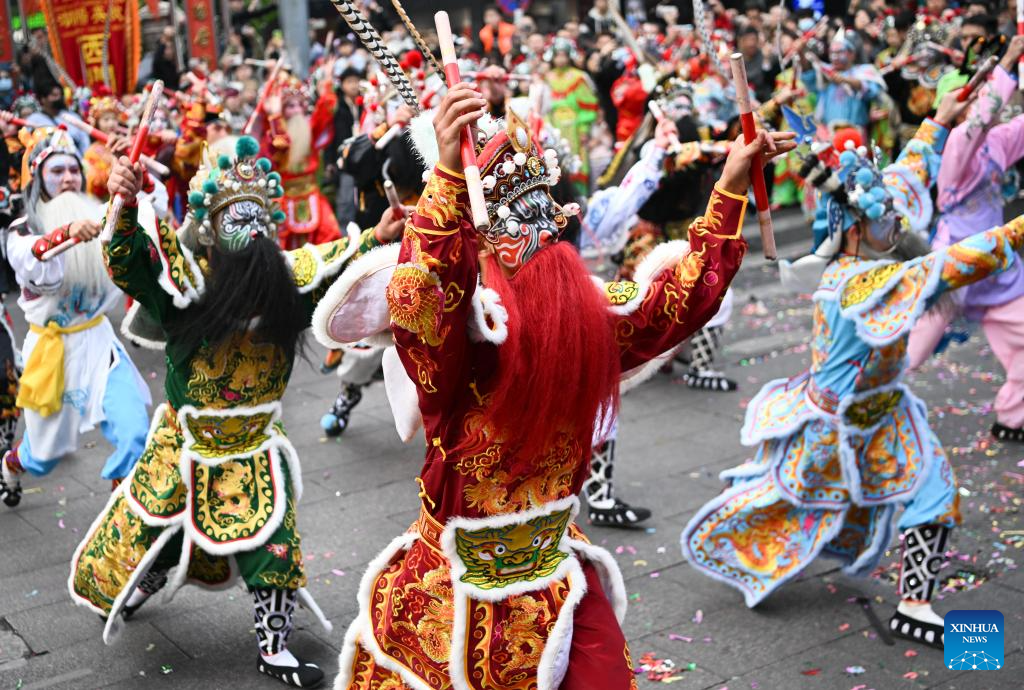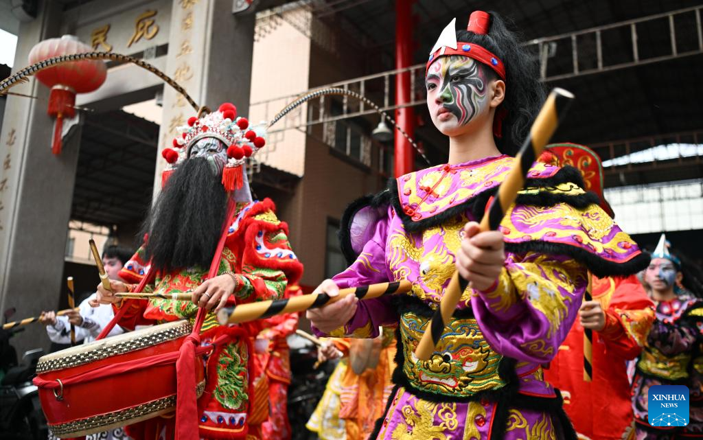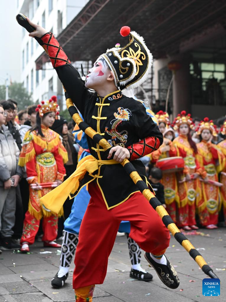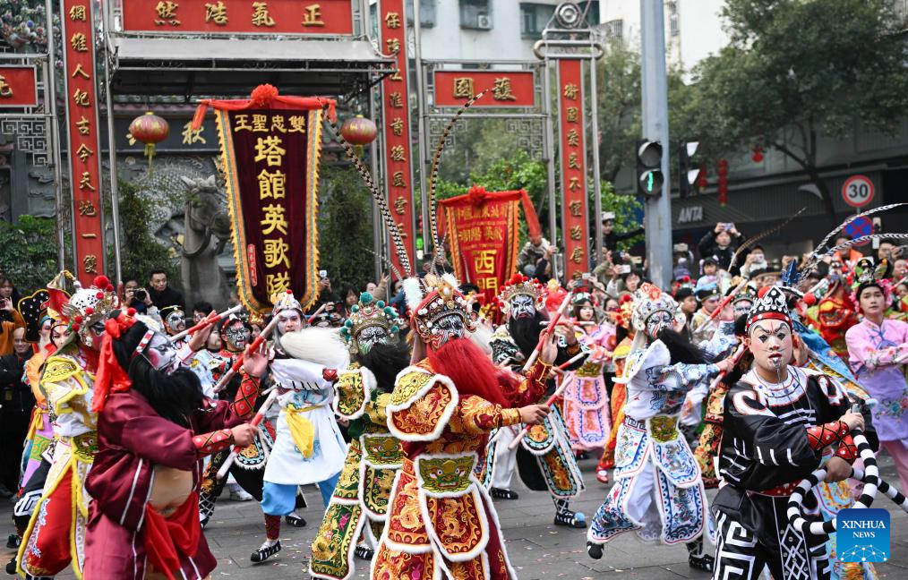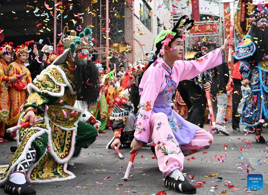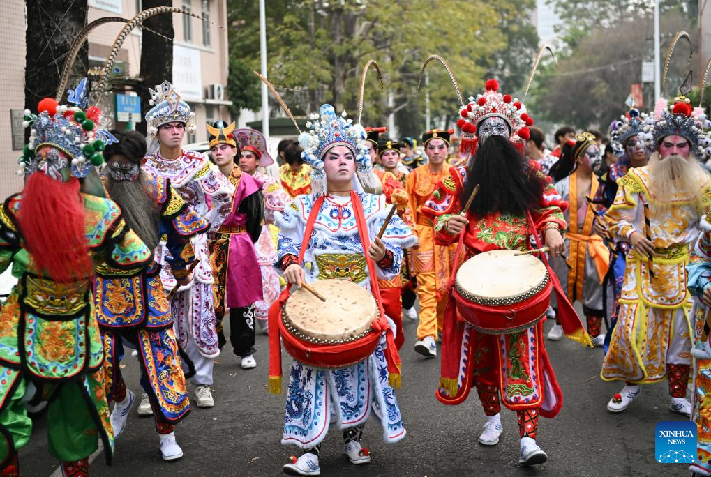 Members of a Yingge dance troupe stage a performance in Chaoyang District of Shantou City, south China's Guangdong Province, Jan. 23, 2025. The traditional Chinese Xiaonian festival is observed in south China on Thursday. In Shantou City, local Yingge dance troupes performed on the streets to mark the festival and greet the upcoming Chinese New Year.