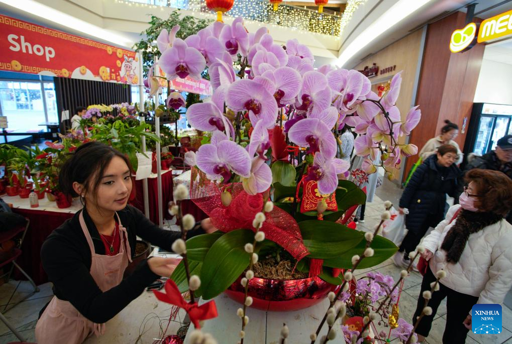 People visit the 2025 Chinese Lunar New Year Flower and Gift Fair in Richmond, British Columbia, Canada, Jan. 23, 2025. The fair kicked off here on Thursday and runs until Jan. 29. (Photo by Liang Sen/Xinhua)