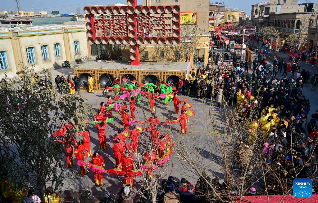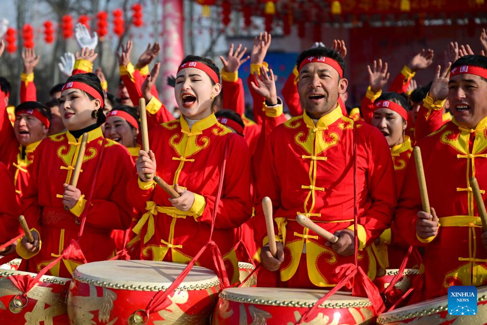 Residents perform Ansai waist-drum, a traditional drum dance, during a "village gala" in Shache County of Kashgar, northwest China's Xinjiang Uygur Autonomous Region, Jan. 22, 2025.