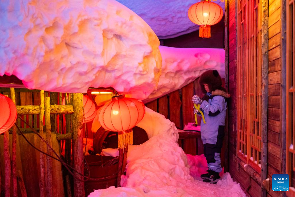A child has fun at China's "Snow Town" scenic spot in Mudanjiang, northeast China's Heilongjiang Province, Jan. 24, 2025.