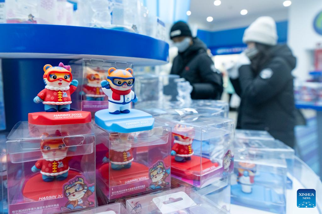 People select cultural and creative products of the Harbin Asian Winter Games at China's "Snow Town" scenic spot in Mudanjiang, northeast China's Heilongjiang Province, Jan. 24, 2025.