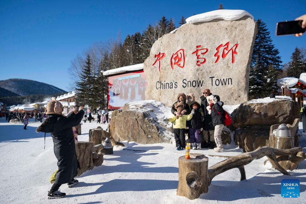 People pose for photos at China's "Snow Town" scenic spot in Mudanjiang, northeast China's Heilongjiang Province, Jan. 25, 2025.
