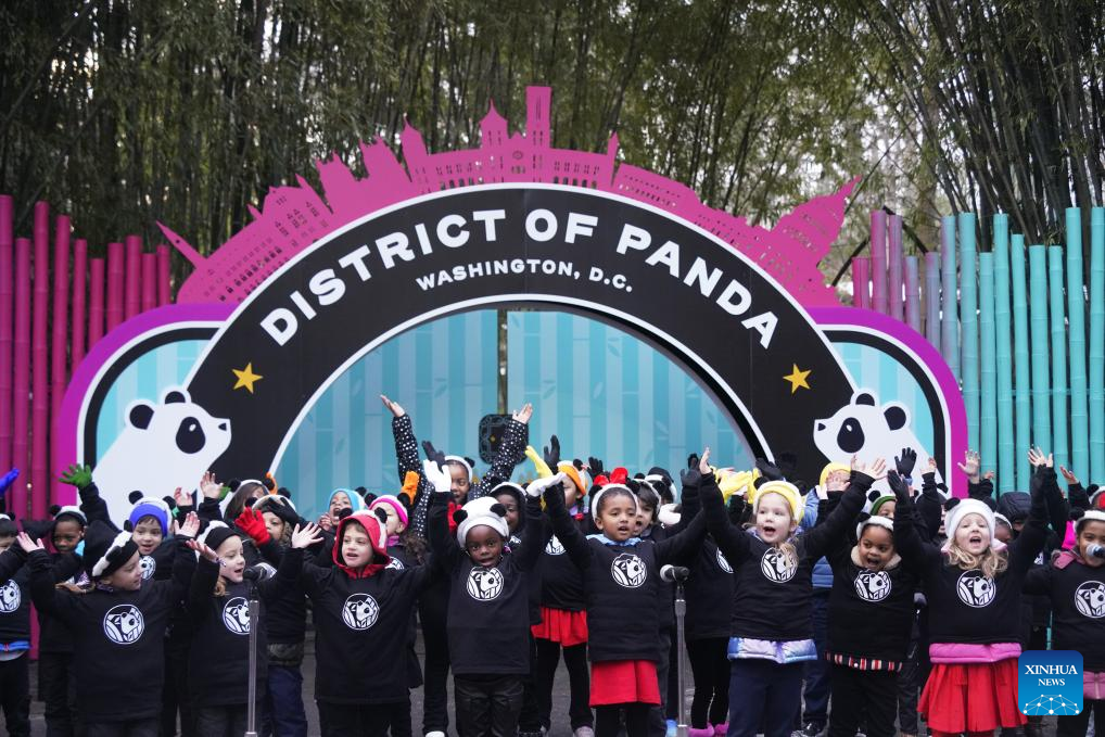 Kids perform during the ceremony to celebrate the official public debut of the giant pandas at the Smithsonian's National Zoo in Washington, D.C., the United States, Jan. 24, 2025. The giant panda couple, Bao Li and Qing Bao, made their first public appearance on Friday since their arrival at the Smithsonian's National Zoo here. Sent as part of a 10-year international giant panda protection cooperation program, the three-year-old pandas, Bao Li, male, and Qing Bao, female, departed their hometown in Sichuan Province and arrived in the U.S. capital city on Oct. 15, 2024. (Xinhua/Wu Xiaoling)
