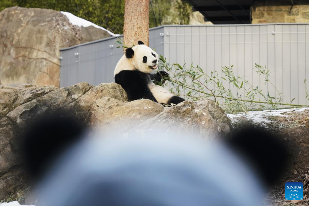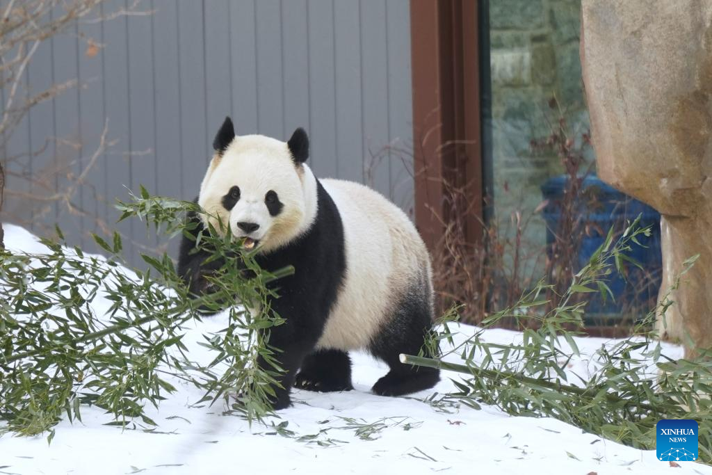 Giant panda Bao Li eats bamboo at the Smithsonian's National Zoo in Washington, D.C., the United States, Jan. 24, 2025. The giant panda couple, Bao Li and Qing Bao, made their first public appearance on Friday since their arrival at the Smithsonian's National Zoo here. Sent as part of a 10-year international giant panda protection cooperation program, the three-year-old pandas, Bao Li, male, and Qing Bao, female, departed their hometown in Sichuan Province and arrived in the U.S. capital city on Oct. 15, 2024. (Xinhua/Wu Xiaoling)