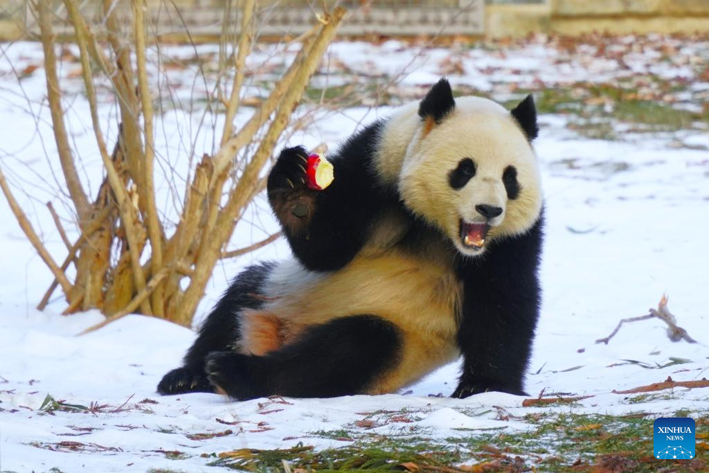 Giant panda Qing Bao eats an apple at the Smithsonian's National Zoo in Washington, D.C., the United States, Jan. 24, 2025. The giant panda couple, Bao Li and Qing Bao, made their first public appearance on Friday since their arrival at the Smithsonian's National Zoo here. Sent as part of a 10-year international giant panda protection cooperation program, the three-year-old pandas, Bao Li, male, and Qing Bao, female, departed their hometown in Sichuan Province and arrived in the U.S. capital city on Oct. 15, 2024. (Xinhua/Wu Xiaoling)