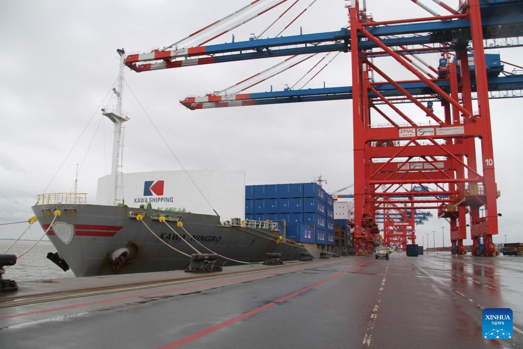 Photo taken on Jan. 24, 2025 shows the "KAWA Ningbo" cargo ship of the "China-Europe Express" in Wilhelmshaven, Germany. The first container ship of the "China-Europe Express", the fastest direct route connecting Europe and China's Yangtze River Delta region, arrived at its destination at the Jade Weser Port in Wilhelmshaven on Friday. The "KAWA Ningbo" cargo ship, carrying over 1700 containers of new-energy and other high-value goods, completed its non-stop voyage in 26 days, well below the shipment time of 45 days in the past. (Xinhua/Shan Weiyi)