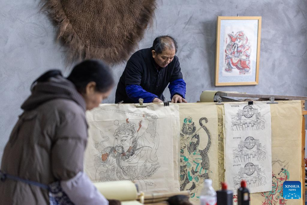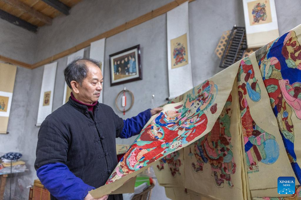 Xu Jiahui checks a New Year woodblock print at his studio in Pingjin Town in Liangping District of southwest China's Chongqing, Jan. 14, 2025. (Xinhua/Huang Wei)