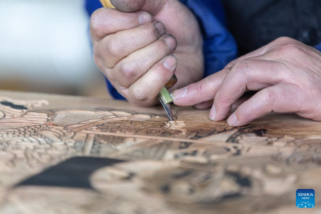 Xu Jiahui carves woodblock at his studio in Pingjin Town in Liangping District of southwest China's Chongqing, Jan. 14, 2025. (Xinhua/Huang Wei)
