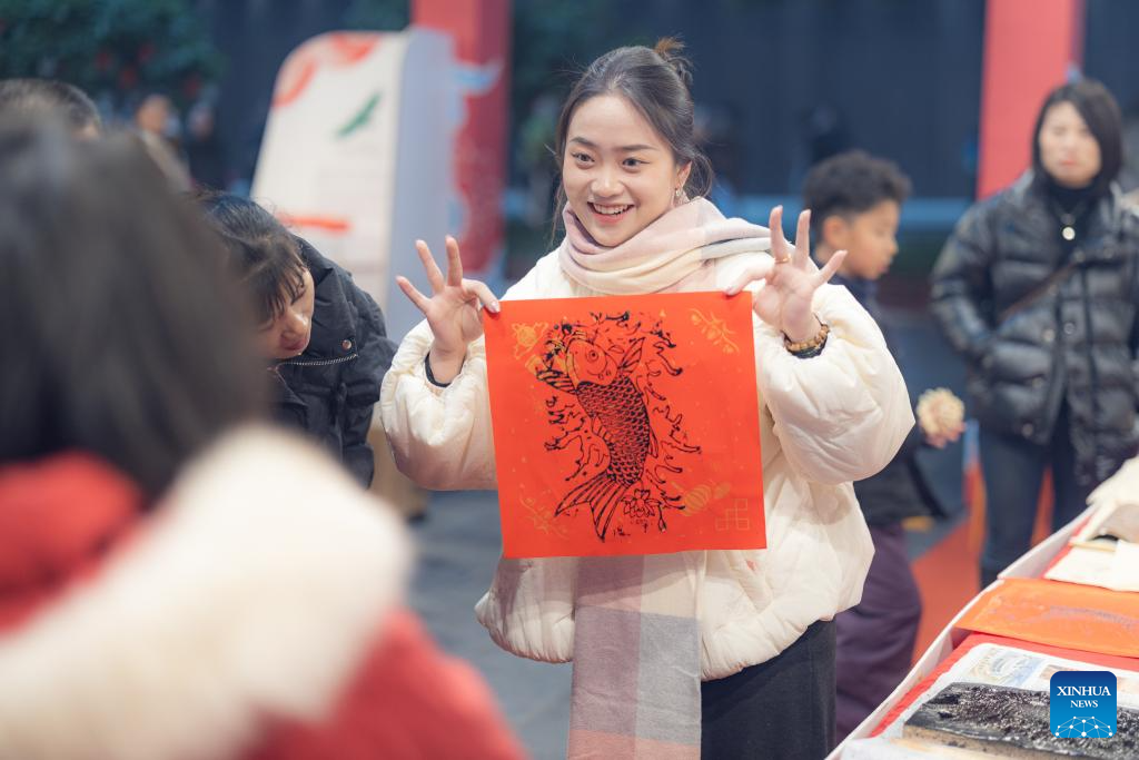 A tourist displays a Liangping New Year woodblock print she made at a New Year intangible cultural heritage fair in Yuzhong District of southwest China's Chongqing, Jan. 22, 2025. (Xinhua/Huang Wei)