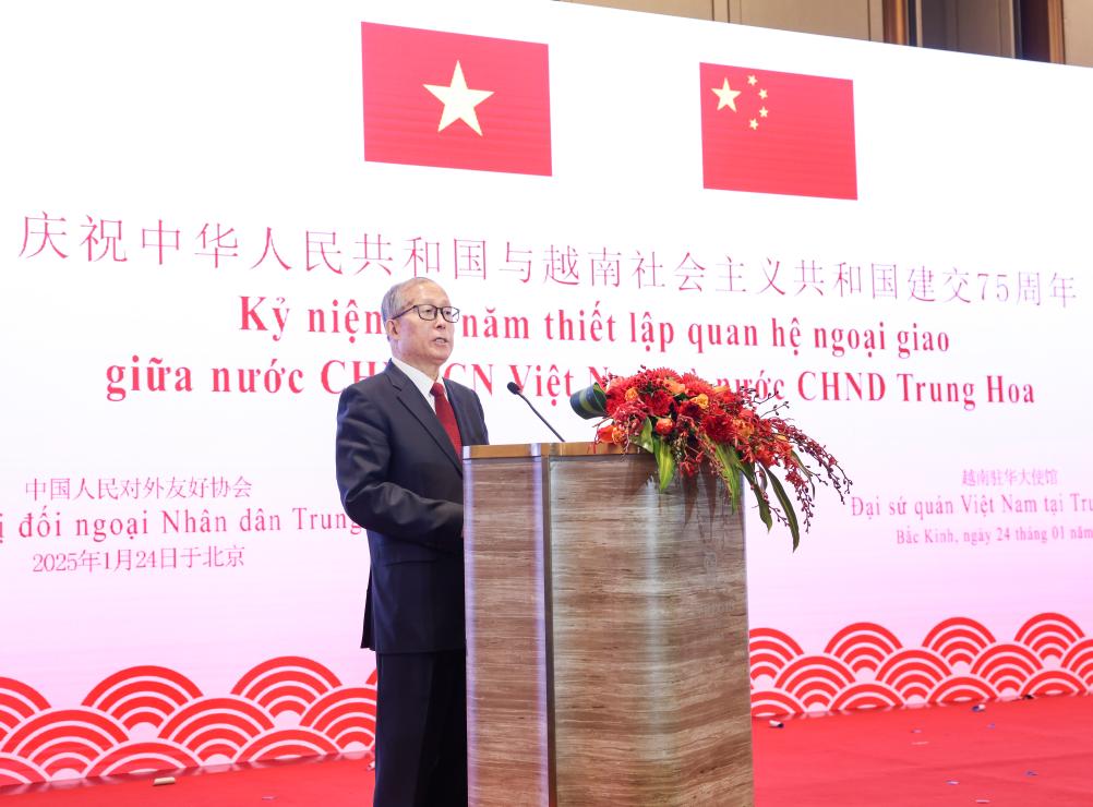 Li Hongzhong, a member of the Political Bureau of the Communist Party of China Central Committee, also vice chairman of the National People's Congress Standing Committee, attends a reception celebrating the 75th anniversary of China-Vietnam bilateral ties in Beijing, capital of China, Jan. 24, 2025. (Xinhua/Pang Xinglei)