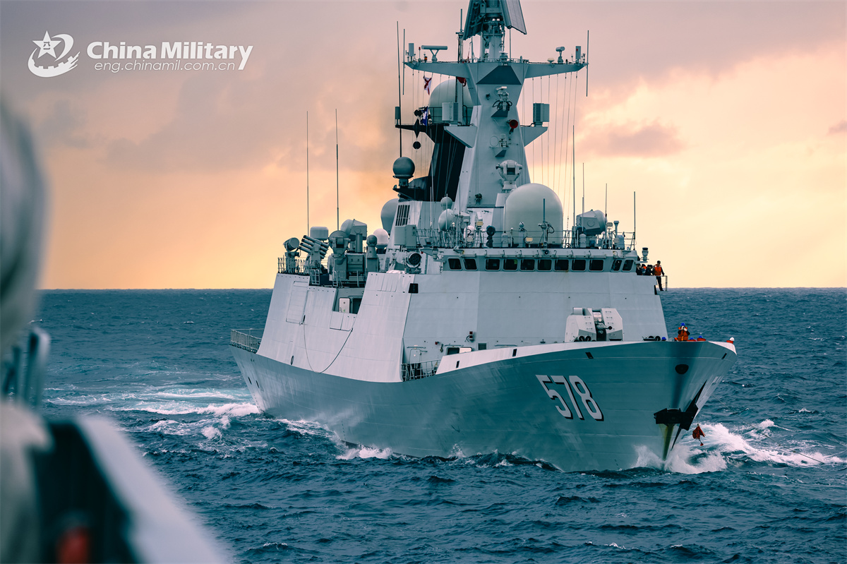 The Type 054A guided-missile frigate Yangzhou (Hull 578) attached to a destroyer flotilla of the navy under the Chinese People's Liberation Army (PLA) Eastern Theater Command sails to the designated sea area during maritime training on December 11, 2024. (eng.chinamil.com.cn/Photo by Wan Haichao)