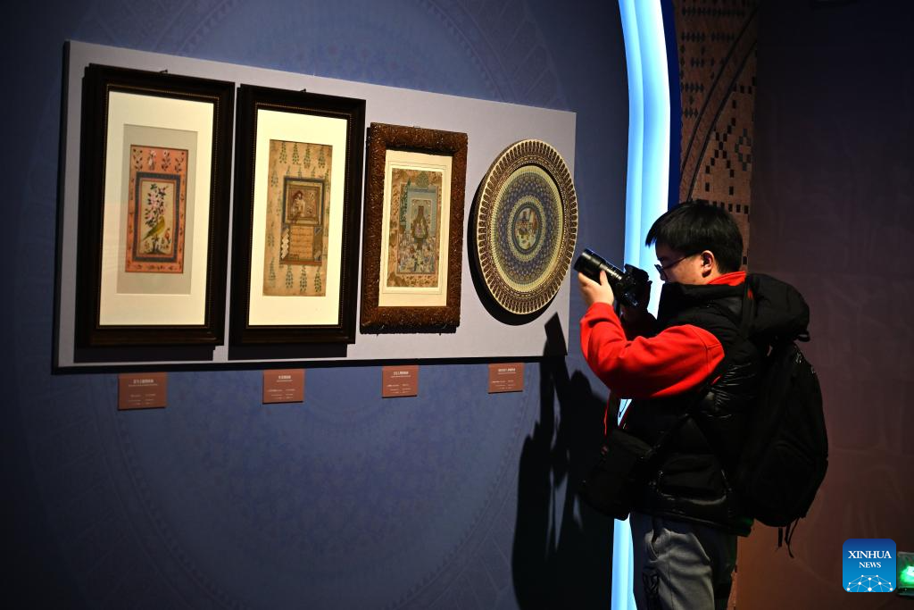 A visitor takes photos of exhibits at an exhibition of Persian artifacts in Sichuan University Museum in Chengdu, southwest China's Sichuan Province, Jan. 25, 2025. The exhibition kicked off here Saturday, showcasing 151 historical pieces or sets of artifacts, which included ceramic, metal and glass objects, as well as textiles, carpets and paintings, from five museums in Iran. (Xinhua/Xue Chen)