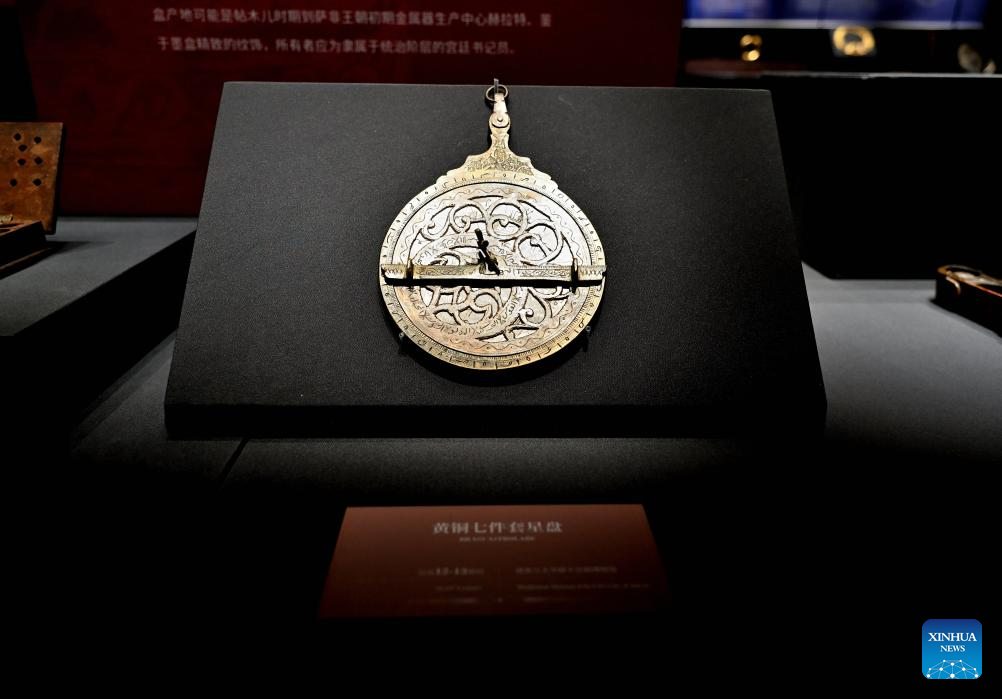 This photo shows an astrolabe on display at an exhibition of Persian artifacts in Sichuan University Museum in Chengdu, southwest China's Sichuan Province, Jan. 25, 2025. The exhibition kicked off here Saturday, showcasing 151 historical pieces or sets of artifacts, which included ceramic, metal and glass objects, as well as textiles, carpets and paintings, from five museums in Iran. (Xinhua/Xue Chen)