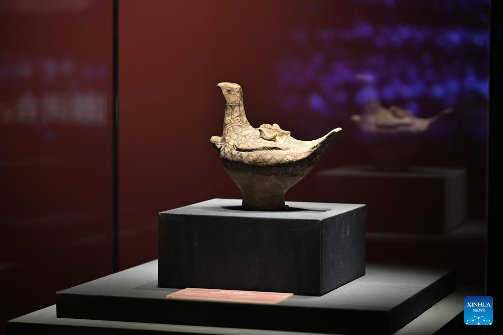 This photo shows a bird-shaped rhyton on display at an exhibition of Persian artifacts in Sichuan University Museum in Chengdu, southwest China's Sichuan Province, Jan. 25, 2025. The exhibition kicked off here Saturday, showcasing 151 historical pieces or sets of artifacts, which included ceramic, metal and glass objects, as well as textiles, carpets and paintings, from five museums in Iran. (Xinhua/Xue Chen)