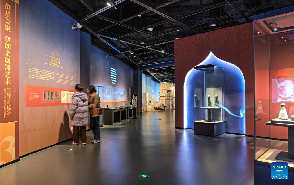 People visit at an exhibition of Persian artifacts in Sichuan University Museum in Chengdu, southwest China's Sichuan Province, Jan. 25, 2025. The exhibition kicked off here Saturday, showcasing 151 historical pieces or sets of artifacts, which included ceramic, metal and glass objects, as well as textiles, carpets and paintings, from five museums in Iran. (Photo by Yan Qi/Xinhua)