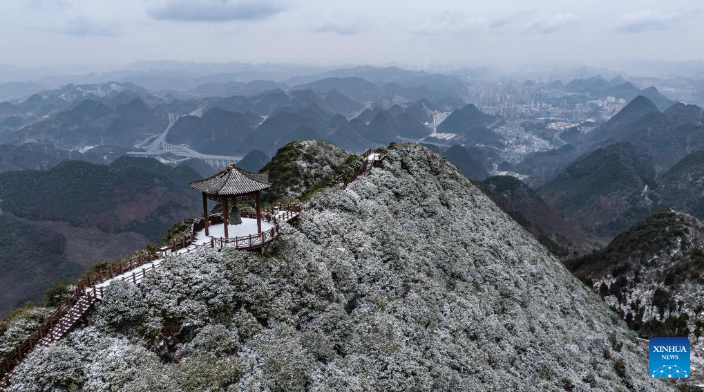An aerial drone photo shows the snow scenery of Zhongshan District of Liupanshui City, southwest China's Guizhou Province, Jan. 26, 2025. (Xinhua/Tao Liang)