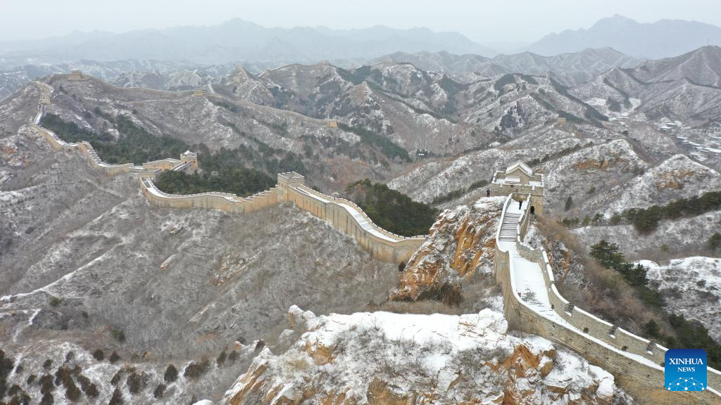 An aerial drone photo shows the snow scenery of the Jinshanling section of the Great Wall in Luanping County, north China's Hebei Province, Jan. 26, 2025. (Photo by Zhou Wanping/Xinhua)