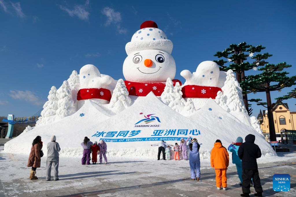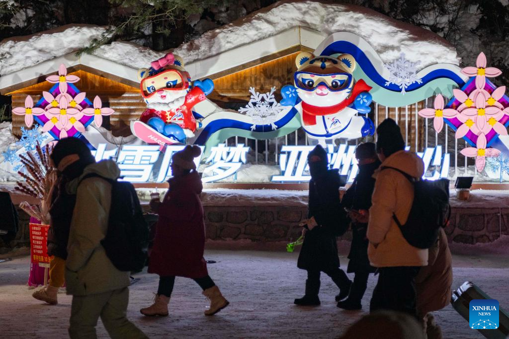 Visitors walk past installations themed on the 2025 Asian Winter Games at China's "Snow Town" scenic spot in Mudanjiang, northeast China's Heilongjiang Province, Jan. 24, 2025. As part of national highway G333, Yaxue Road connects Harbin, Yabuli, and "Snow Town," all of them iconic winter tourist attractions in northeast China, offering visitors the natural and cultural charm of the region. (Xinhua/Xie Jianfei)