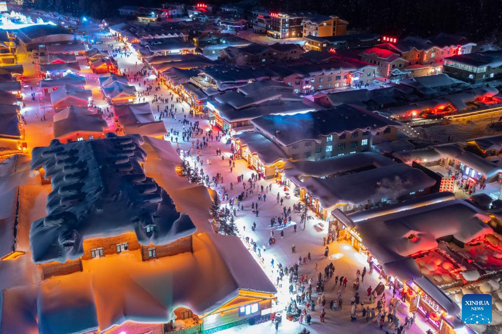 A drone photo taken on Jan. 24, 2025 shows a night view at China's "Snow Town" scenic spot along the Yaxue Road in Mudanjiang, northeast China's Heilongjiang Province. As part of national highway G333, Yaxue Road connects Harbin, Yabuli, and "Snow Town," all of them iconic winter tourist attractions in northeast China, offering visitors the natural and cultural charm of the region. (Xinhua/Xie Jianfei)