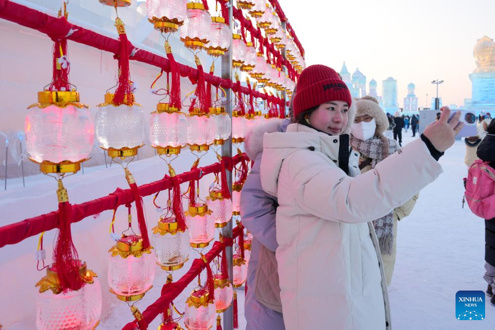 Tourists take selfies at the Harbin Ice-Snow World in Harbin, northeast China's Heilongjiang Province, Jan. 23, 2025. As of 10 p.m. Sunday, the bustling Harbin Ice-Snow World had received more than 2 million visitors since it opened on Dec. 21, 2024. As the city's iconic landmark, the Harbin Ice-Snow World, with this year's edition, the largest in its history, boasts 1 million square meters, up from last year's 800,000 square meters. More than 300,000 cubic meters of ice and snow were used in its construction. (Xinhua/Wang Jianwei)