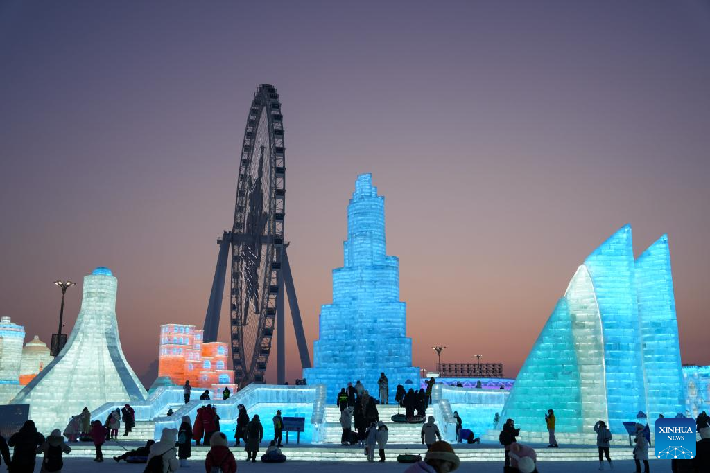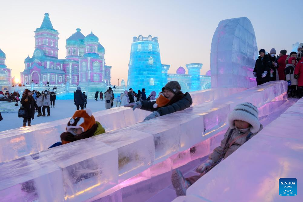 People visit the Harbin Ice-Snow World in Harbin, northeast China's Heilongjiang Province, Jan. 23, 2025. As of 10 p.m. Sunday, the bustling Harbin Ice-Snow World had received more than 2 million visitors since it opened on Dec. 21, 2024. As the city's iconic landmark, the Harbin Ice-Snow World, with this year's edition, the largest in its history, boasts 1 million square meters, up from last year's 800,000 square meters. More than 300,000 cubic meters of ice and snow were used in its construction. (Xinhua/Wang Jianwei)