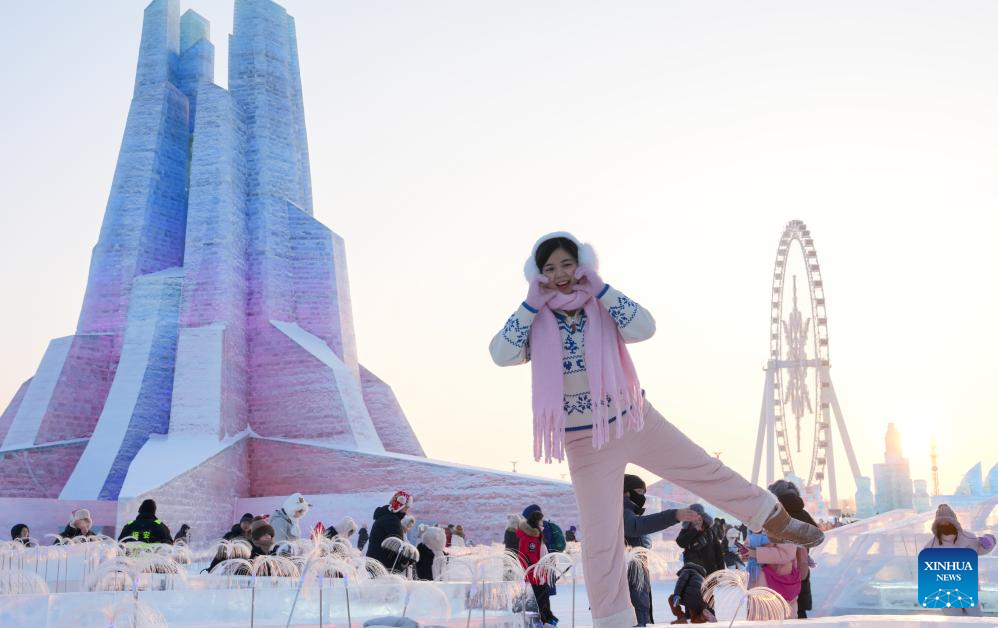 A tourist poses for photos at the Harbin Ice-Snow World in Harbin, northeast China's Heilongjiang Province, Jan. 23, 2025. As of 10 p.m. Sunday, the bustling Harbin Ice-Snow World had received more than 2 million visitors since it opened on Dec. 21, 2024. As the city's iconic landmark, the Harbin Ice-Snow World, with this year's edition, the largest in its history, boasts 1 million square meters, up from last year's 800,000 square meters. More than 300,000 cubic meters of ice and snow were used in its construction. (Xinhua/Wang Jianwei)