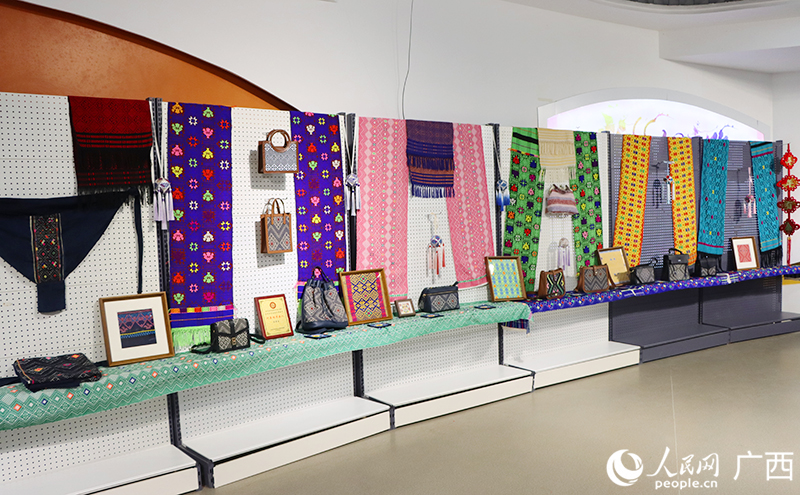 Photo shows Zhuang brocade products on display at the handicraft cooperative named after Li Suying in Longzhou county, south China's Guangxi Zhuang Autonomous Region. (People's Daily Online/Wei Huan)