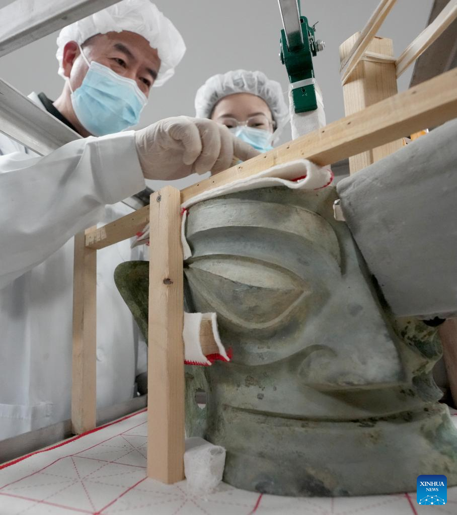 Guo Hanzhong (3rd R) checks a bronze head at Sanxingdui Museum in Guanghan City, southwest China's Sichuan Province, Dec. 18, 2024.
