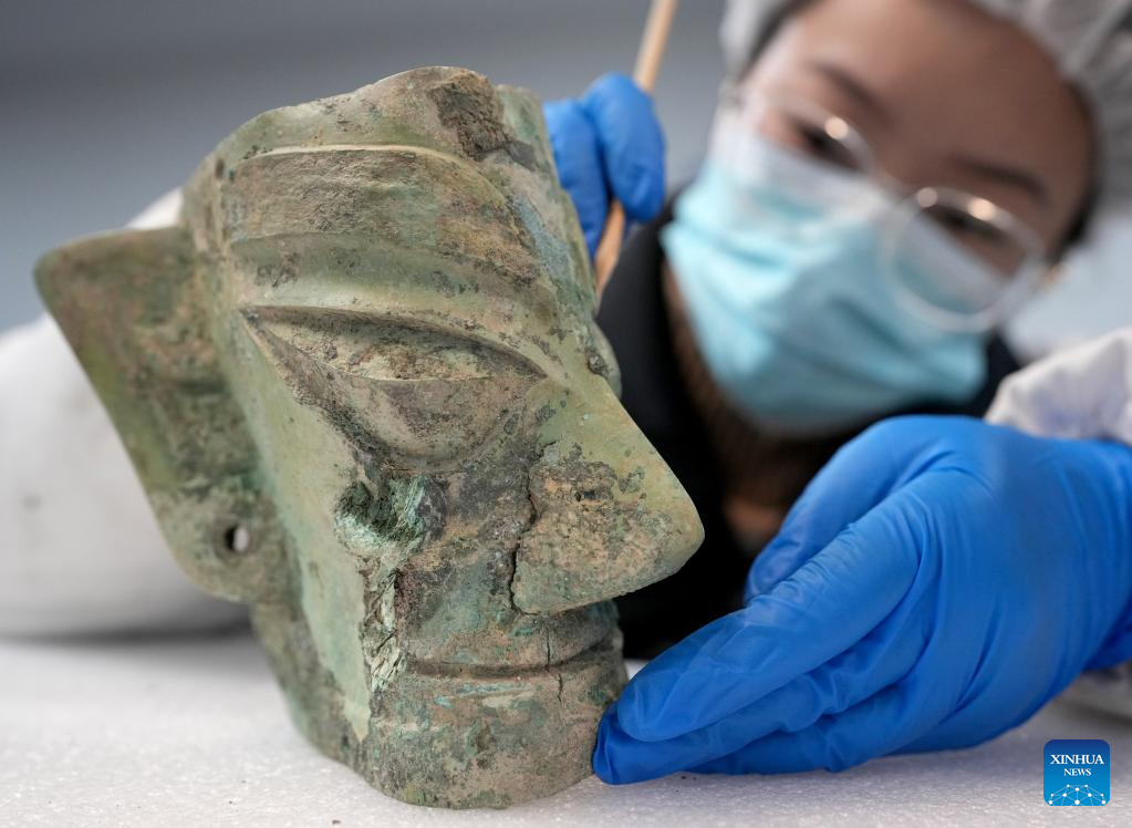 A restorer cleans a bronze mask at Sanxingdui Museum in Guanghan City, southwest China's Sichuan Province, Dec. 18, 2024.