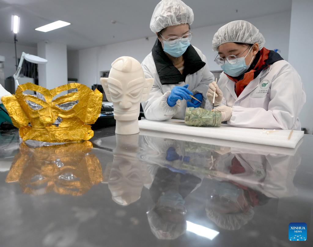 Restorers work on cleaning a bronze mask at Sanxingdui Museum in Guanghan City, southwest China's Sichuan Province, Dec. 18, 2024.