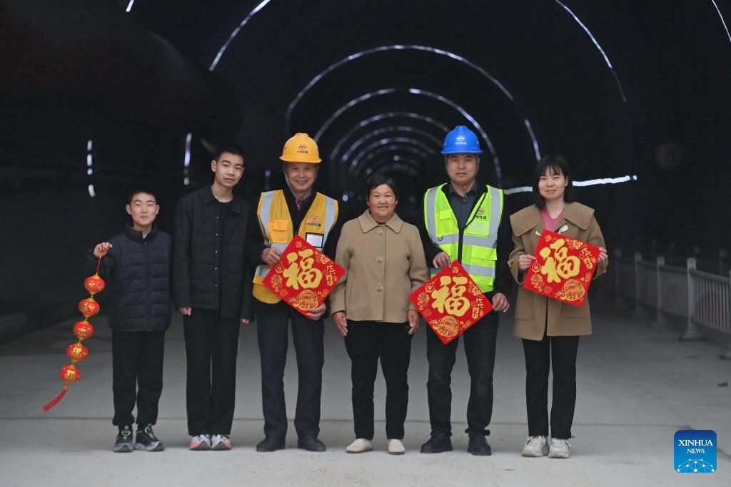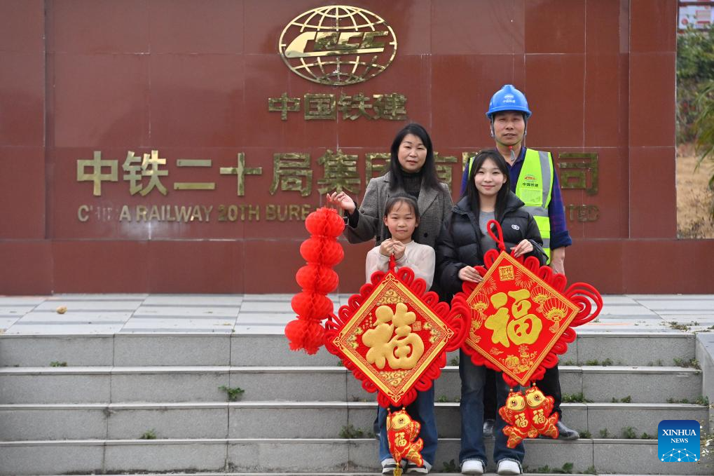 Workers and their family members are pictured at the construction site of an expressway linking Yufeng and Yizhou of south China's Guangxi Zhuang Autonomous Region in Liuzhou of Guangxi, Jan. 22, 2025.