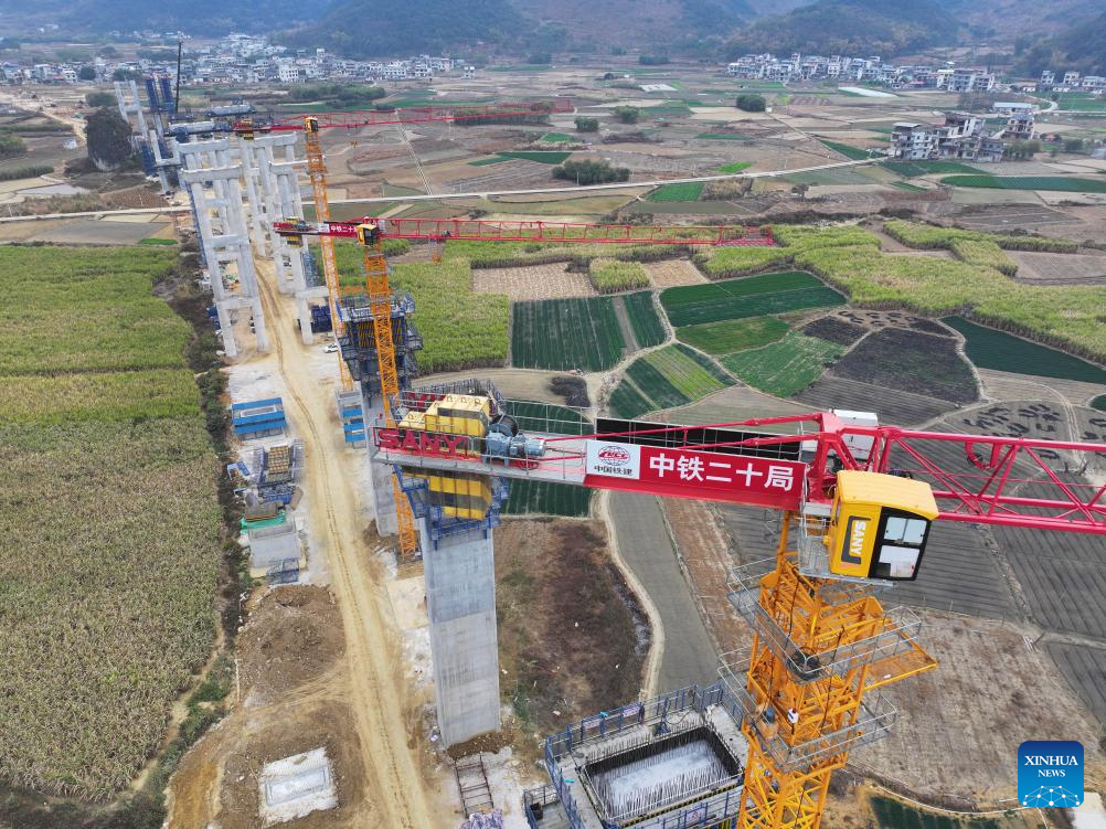 Workers are pictured at the construction site of an expressway linking Yufeng and Yizhou of south China's Guangxi Zhuang Autonomous Region in Liuzhou of Guangxi, Jan. 23, 2025.