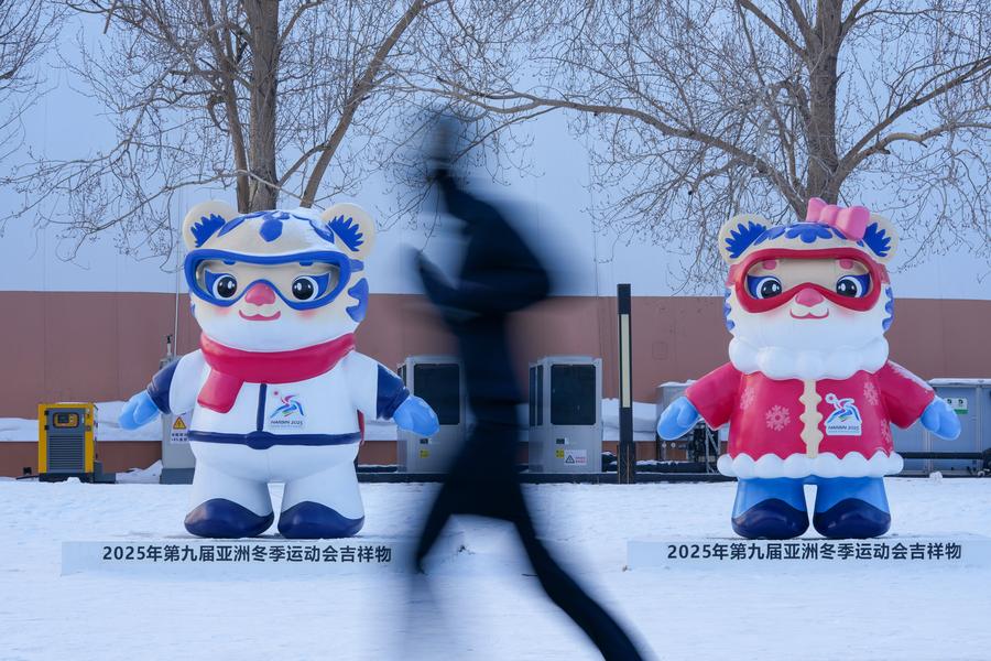 A citizen runs past mascots of the 9th Asian Winter Games Harbin 2025 Binbin (L) and Nini in Harbin, northeast China's Heilongjiang Province, on Jan. 8, 2025. (Xinhua/Wang Jianwei)