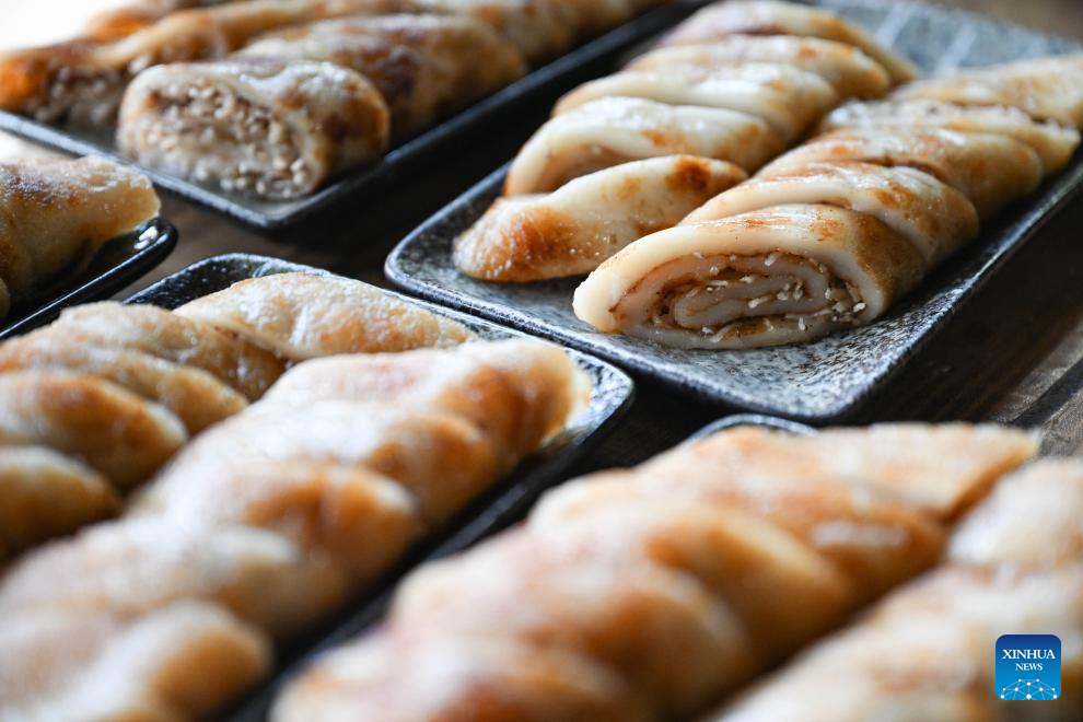 This photo taken on Jan. 28, 2025 shows rolls made from sticky rice and coconuts at Binglanggu tourism area in Baoting Li and Miao Autonomous County, south China's Hainan Province. An event featuring Li ethnic group culture was held at Binglanggu tourism area to celebrate the Chinese New Year, where tourists could dress in traditional Li attire and taste food with Li characteristics. (Xinhua/Pu Xiaoxu)