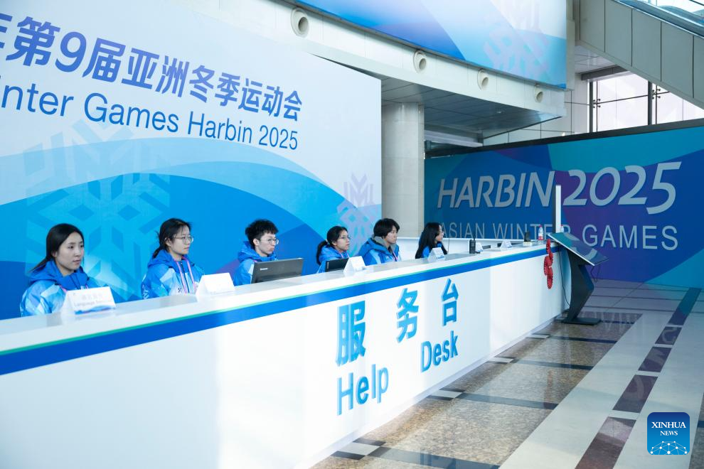 Picture taken on Jan. 31, 2025 shows the help desk in the Main Media Center (MMC) of the 2025 Asian Winter Games in Harbin, northeast China's Heilongjiang Province. With a week to go before the opening ceremony of the 2025 Asian Winter Games in Harbin, the Main Media Center (MMC) started its official operation on Friday. (Xinhua/Zhang Tao)