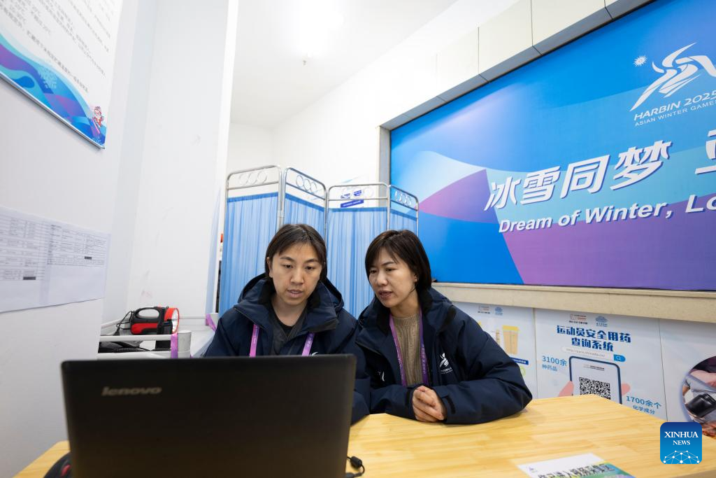 Picture taken on Jan. 31, 2025 shows staff work at the medical center in the Main Media Center (MMC) of the 2025 Asian Winter Games in Harbin, northeast China's Heilongjiang Province. With a week to go before the opening ceremony of the 2025 Asian Winter Games in Harbin, the Main Media Center (MMC) started its official operation on Friday. (Xinhua/Zhang Tao)