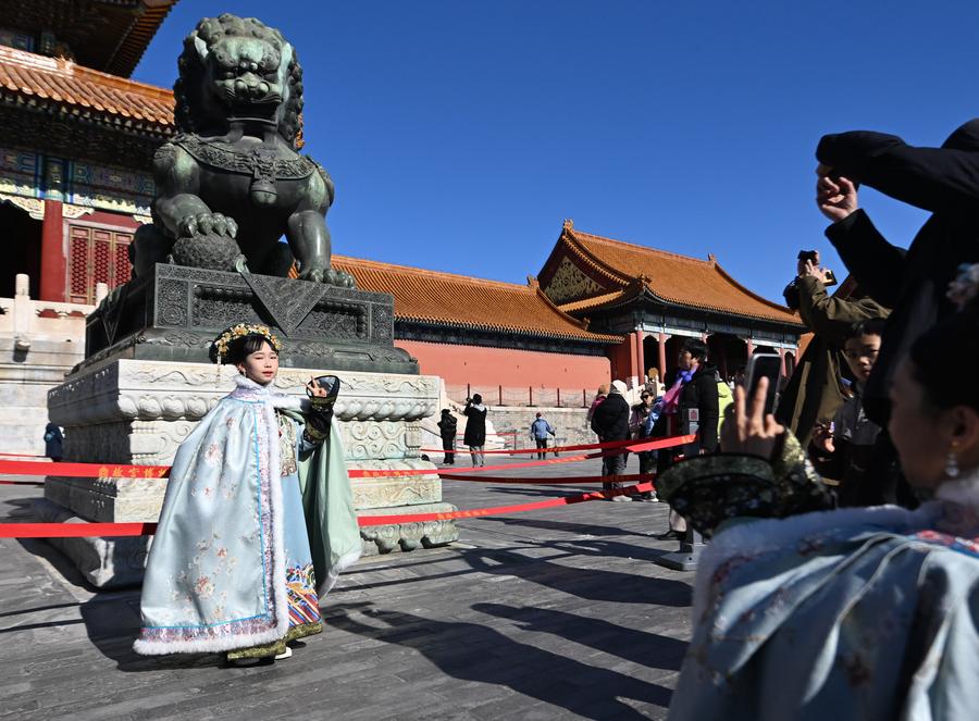 A girl poses for photos at the Palace Museum along the Central Axis in Beijing, capital of China, Feb. 2, 2025. (Xinhua/Zhang Chenlin)